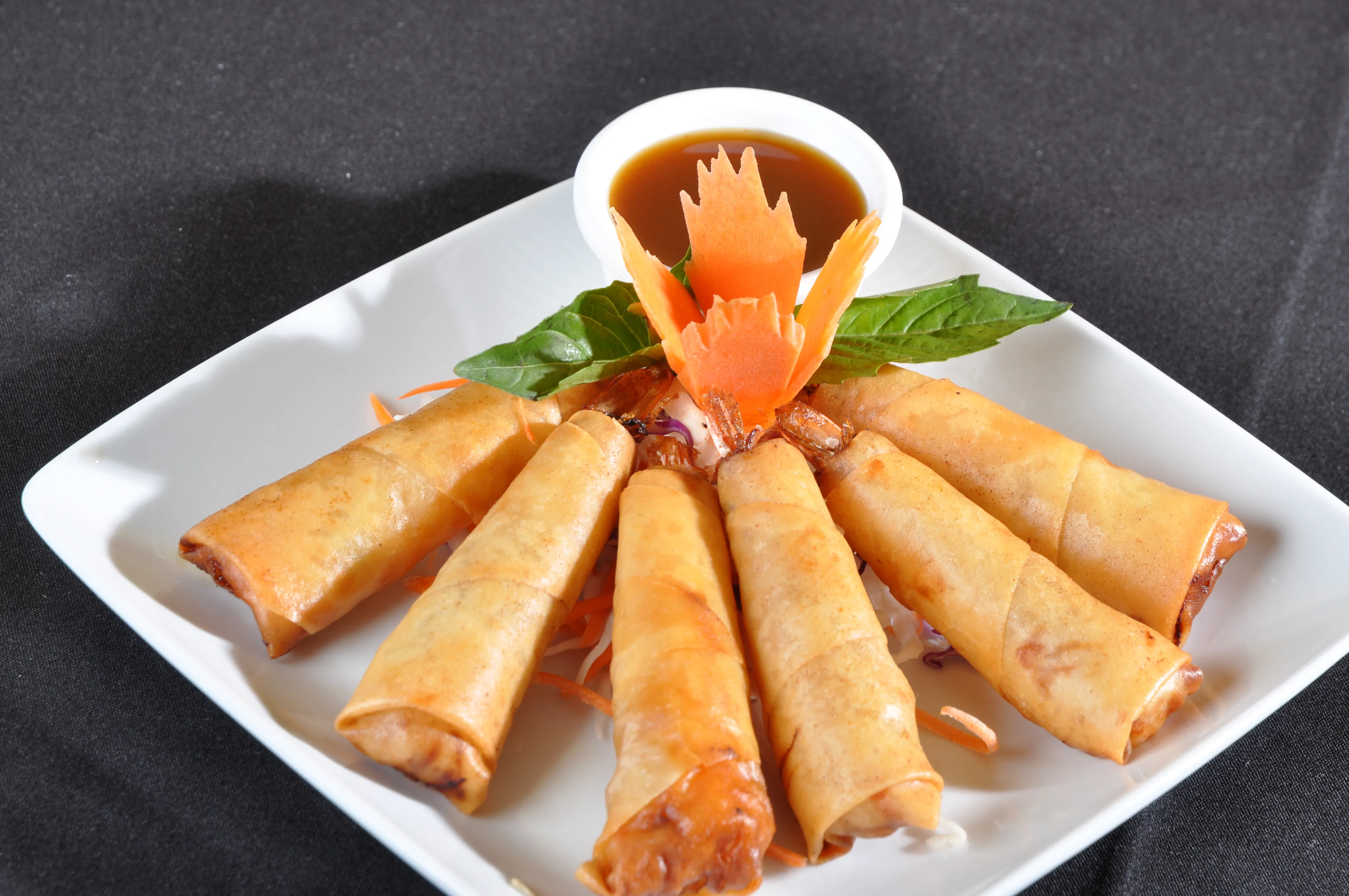Deep Fried Wrapped Ground Pork, Mixed Vegetables, Glass Noodles, And Eggs Served With Plum Sauce